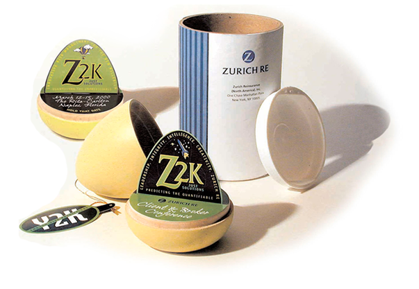 The President of Zurich Re asked me to think outside the box and create a memorable promotion for his annual conference for Zurich Re’s most important clients on the eve of the New Millennium (1999). This pear-shaped, wooden container was a big WOW!! … but a challenge to make two or three identical … much less 100.